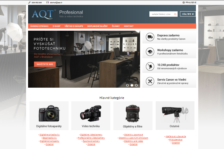Zmeny sa však netýkajú len grafiky. Vylepšujeme všetko, čo sa dá. Predaj profesionálnej foto a video techniky rozširujeme na viac ako 10 000 produktov od renomovaných výrobcov. Všetku techniku, ktorá súvisí s videom a fotografiou nájdete teraz pod jednou strechou na eshope aqt.sk. Menu kategórií dostalo nové členenie na DIGITÁLNE FOTOAPARÁTY, OBJEKTÍVY A FILTRE, VIDEO TECHNIKA, ATELIÉROVÉ VYBAVENIE, PRÍSLUŠENSTVO, ĎALŠÍ SORTIMENT a PROFESSIONAL.