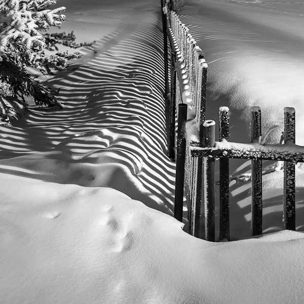 Čerstvo nasnežené ráno a tiene plota v mestečku Boží Dar, Krušné hory