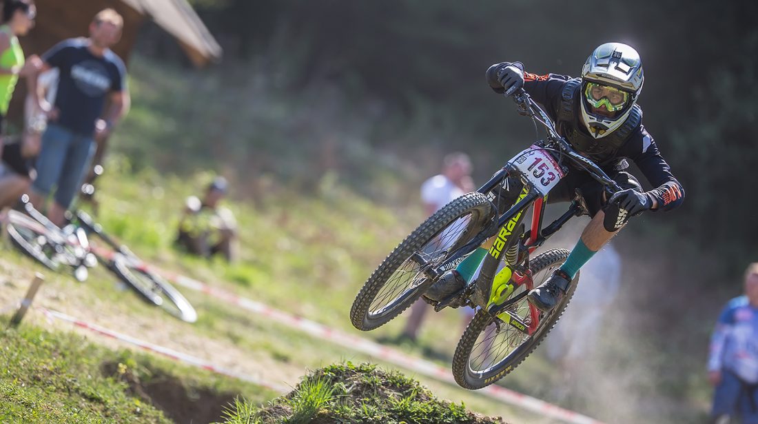 Jasenska dolina SPDH. April 22. 2018 Jazdec v katogorií Dovnhill na záverečnej časti traťe v rýchlom skoku.