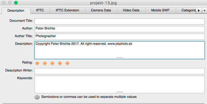 Najdôležitejší bod je asi správne vyplnenie metadát. Priamo vo fotoaparáte, alebo v ľubovoľnom editore si môžete vypísať autora fotografie. Takto zabezpečíte, že vaše zábery budú mať v metadátach v IPTC profile, zapísané údaje autora.